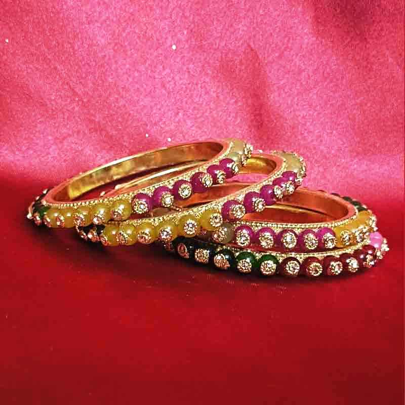 Vibrant Multi-Color Design: Beautifully crafted bangles featuring colorful stones (green, yellow, pink & maroon) with dazzling crystal embellishments.